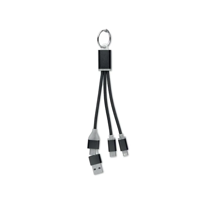 Brelok do kluczy z kablami do ładowania z wejściem: 2 w 1 typu C i typu A oraz micro-B (2 w 1 pin) i wyjściem typu C.