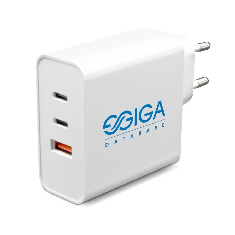 Ładowarka ścienna z wyjściem USB oraz 2 wyjściami USB typu C, moc całkowita do 65W, wejście 100-240V, wyjście USB typu C 5-15V/3A, wyjście USB 5-12V/1.5-3A, do użytku wewnątrz pomieszczeń